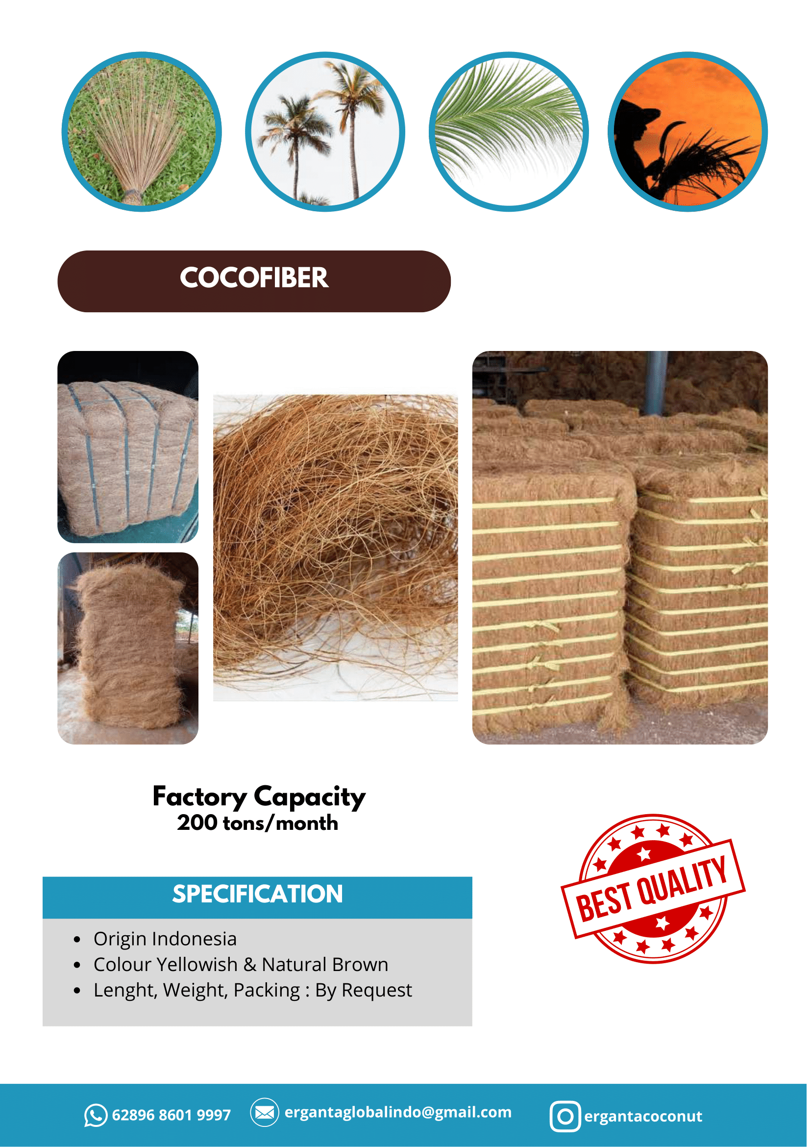 Coco Fiber yang kami produksi tersedia dalam berbagai panjang serat, tingkat kerapian, dan kadar kotoran rendah sesuai kebutuhan industri pengguna. Dengan dukungan fasilitas produksi berkapasitas besar dan pasokan bahan baku yang stabil, kami mampu memenuhi permintaan pasar secara berkelanjutan. Produk ini sangat diminati karena sifatnya yang ramah lingkungan, biodegradable, serta tahan lama, menjadikannya pilihan ideal bagi perusahaan yang mengutamakan material berkelanjutan.