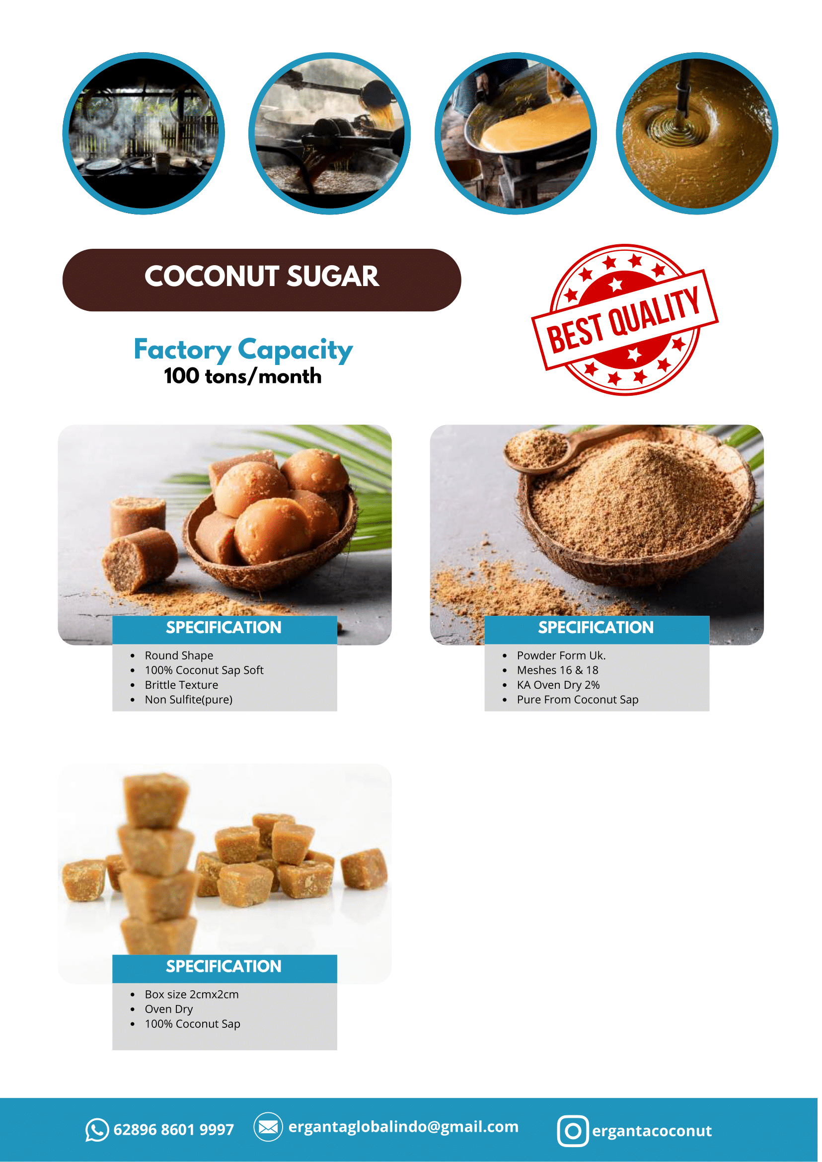 Nira kelapa yang digunakan berasal dari pohon kelapa pilihan yang dipanen secara tradisional oleh petani berpengalaman, kemudian disaring dan diproses dalam fasilitas higienis untuk memastikan warna, aroma, dan kadar air tetap stabil. Produk ini tersedia dalam berbagai bentuk seperti granule, powder, dan block untuk memenuhi kebutuhan industri maupun konsumen akhir. Dengan sistem quality control berlapis serta dukungan sertifikasi seperti organik, halal, dan food safety (sesuai permintaan), coconut sugar kami siap bersaing di pasar internasional dan menjadi pilihan utama untuk pemanis alami berkualitas tinggi.