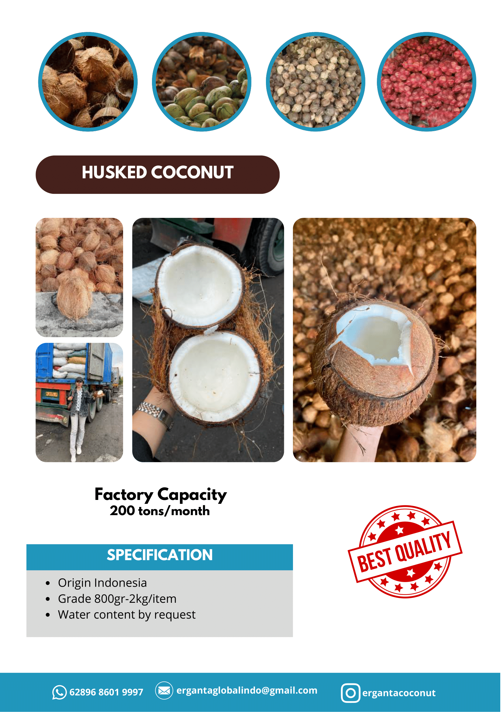 Dengan reputasi Indonesia sebagai salah satu negara penghasil kelapa terbesar di dunia, kami berkomitmen untuk memberikan kualitas terbaik dan layanan profesional kepada seluruh mitra bisnis. Husked Coconut yang kami tawarkan memenuhi kriteria mutu internasional, menjadikannya pilihan terpercaya bagi importir, distributor, dan pelaku industri global yang membutuhkan produk stabil, higienis, dan siap olah.